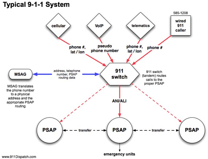 | When the three-digit number is dialed, a call taker/dispatcher in the local public safety answering point (PSAP), or 9-1-1 call center, answers the call. The emergency and its location are communicated by voice (or TTY) between the caller and the call taker. | ||||||||||||||||||||||||