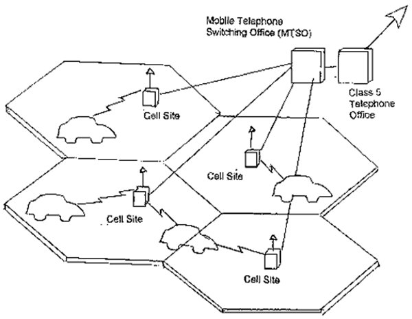 | The Cellular Telephone System The schematic below shows the architecture of the cellular telephone network. The customer (subscriber) has a telephone unit that communicates via radio with a cell tower. The system is designed so that there are numerous cell towers covering a region. At any time, a given subscriber's call is controlled by the cell site closest to him or her. The neighboring cells can detect the communication. When the customer moves from one cell to another, called roaming, the system automatically assigns the new cell cite as the controlling site. Call channels are allocated so that two adjacent cells do not use the same channel. Each of the cell sites is connected to a cell end office called the Mobile Telephone Switching Office (MTSO). The MTSO is connected by trunks to the Public Switched Telephone Network. This architecture allows cell phone users to call other cell phone users as well as wireline subscribers. | ||||||||||||||||||||||||