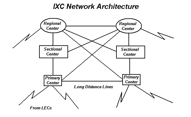 | The diagram below shows the architecture for the Interexchange Carriers. These networks connect the local carriers. Calls that traverse these networks are long distance calls. | ||||||||||||||||||||||||