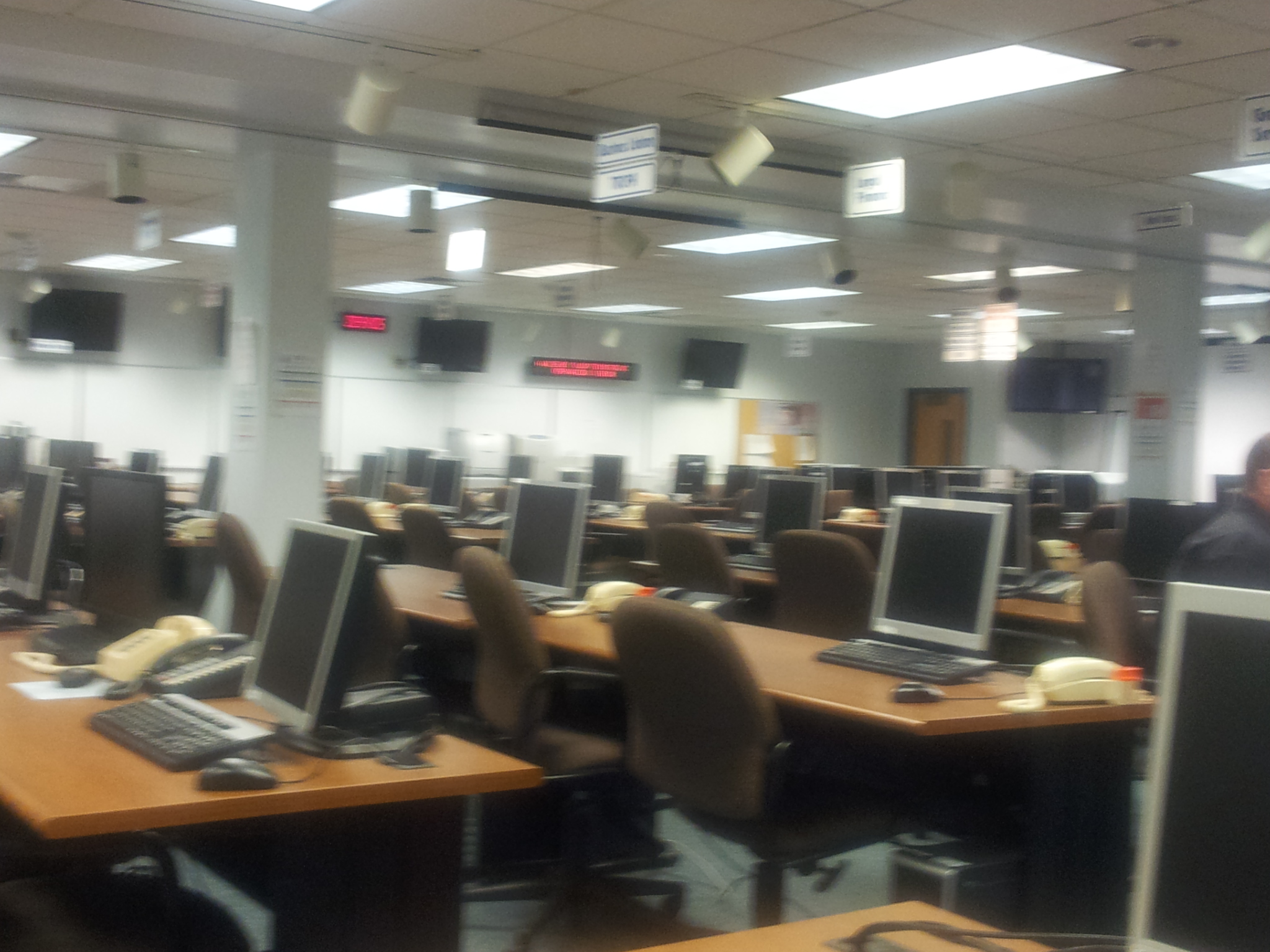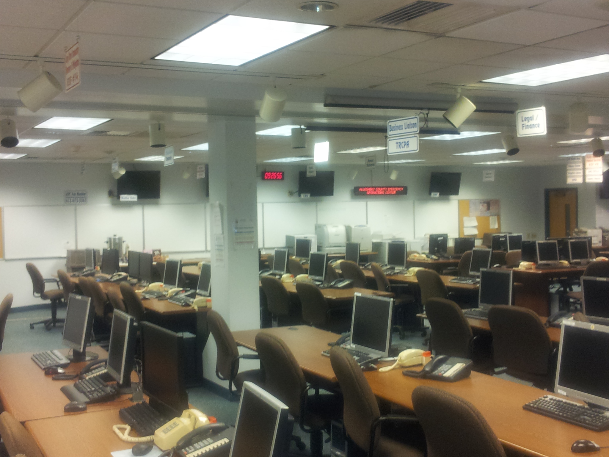 | Positioned around the perimeter of the room, the EOC has screens to monitor broadcast channels that may carry news of interest. These include: |
