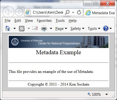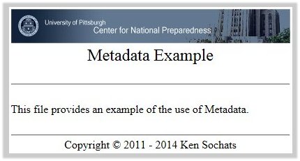 | Your browser relies on Metadata to decide how to process a file. The first example below shows how the browser interprets a file encoded with Hyper Text Markup Language (HTML) which is one of the standard ways the browser works. You can achieve this same result by clicking on the link MetadataExample.htm. | |||||||