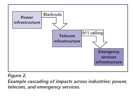 - Telecommunications: Congestion or disruption of key communications nodes by fire, wind, water, or sabotage