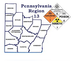 | Within Pennsylvania emergency respons is organized into regional coordinating groups or task forces. Our area is the Southwetern Pennsylvania Emergency Response Group more commonly referred to as Pennsylvania Region 13 (www.pa-region13.org). |  |